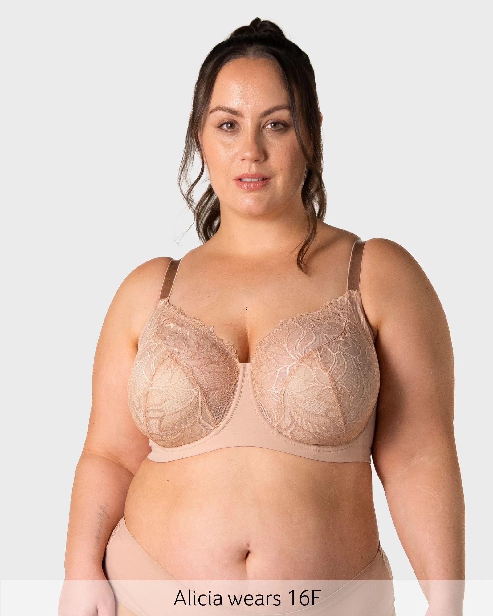 Fall in love with lace thatĀ supports without compromise, based on our top selling style Temptation. Refined is designed to support and uplift post-breastfeeding bodies. This underwired bra features flexible support that moves with you, ensuring comfort throughout the day. Crafted with soft lace and a smooth microfibre base, it offers a seamless fit under clothing. Innovative underarm panel delivers a sleek, polished finish under clothing. Adjustable straps and a cross-back option provide a customisable fit, while the full coverage design offers natural lift and shape. Experience the perfect blend of style and support with the Refined Flexiwire Bra.